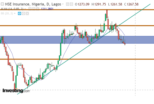 The NGXINS slightly closed below its support zone between 1307.89 and 1272.42, closing at 1267.58. The initial bullish sentiment couldn’t dominate the bears in the market. Looking at historical data, 1272.42 has been a strong support level for this sector’s index. However, the double-top chart formation at 1360.79 validates this current support level breakout.