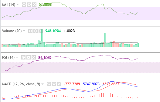 Volume traded above its moving average to confirm the strength of the bullish sentiment. RSI and MFI indicate a strong market momentum. Finally, MACD remains bearish. With this price action, market players will take advantage of a pullback at 5524.24 and 5541.30 using the ALMA and Bollinger bands’ moving average.