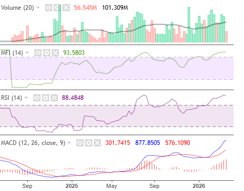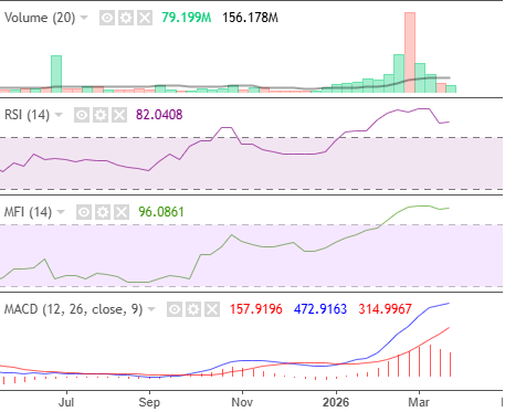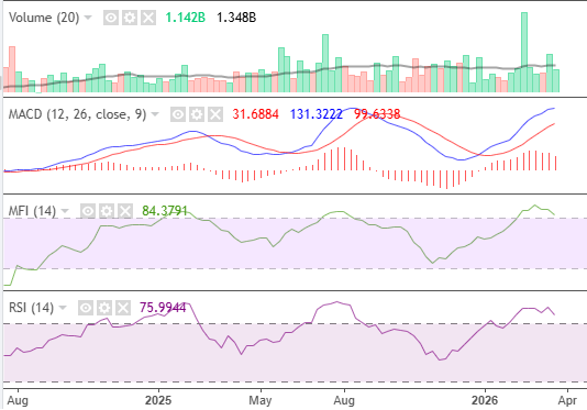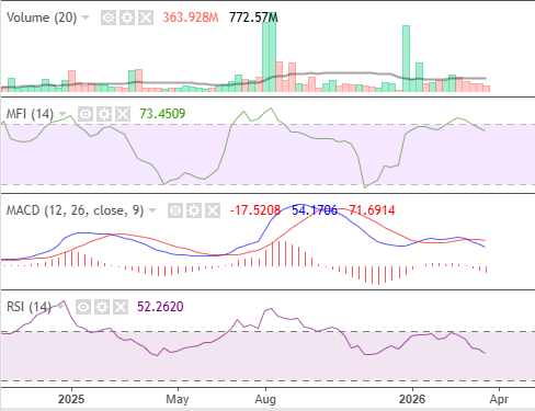 According to these indicators, the market hasn’t recovered from last month’s profit-taking, despite remaining strong above its moving average. Liquidity and momentum remain sustainable, while volume is relatively low. MACD indicates a loss in momentum.