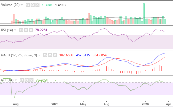 The consumer goods index consolidated within its resistance zone. It also remained above its moving average, closing at 5568.77. The index started April on a positive note, with the possibilities of a resistance breakout.