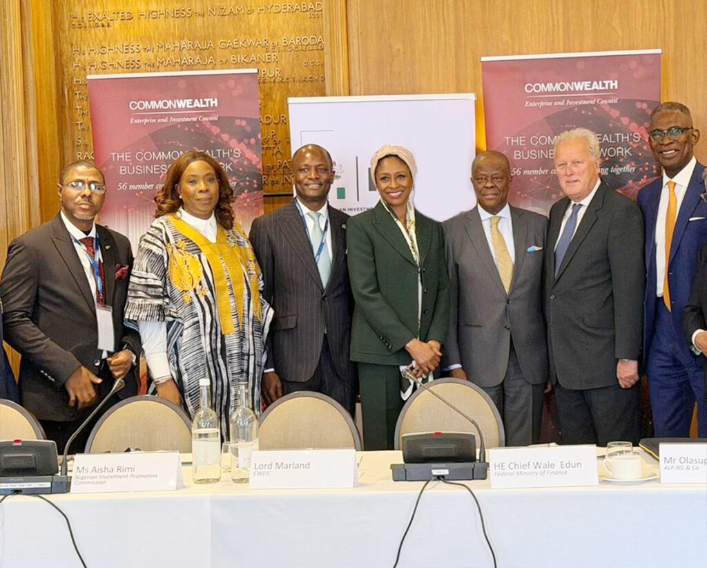 Caption: From left, Chief Executive Officer, Central Securities Clearing System PLC (CSCS), Shehu Shantali; Lagos State Commissioner for Commerce, Cooperatives, Trade and Investment, Mrs. Folashade Bada Ambrose; GMD/CEO of Nigerian Exchange Group, Mr. Temi Popoola; Executive Secretary and Chief Executive Officer of the Nigerian Investment Promotion Commission (NIPC), Ms. Aisha Rimi; Minister of Finance and Coordinating Minister of the Economy of Nigeria, Wale Edun; Chairman of the Commonwealth Enterprise and Investment Council, Lord Marland; and Country Chair – Nigeria, Commonwealth Enterprise and Investment Council, Olasupo Shasore SAN at the Nigerian-United Kingdom Investment Roundtable by NIPC in London on Monday.