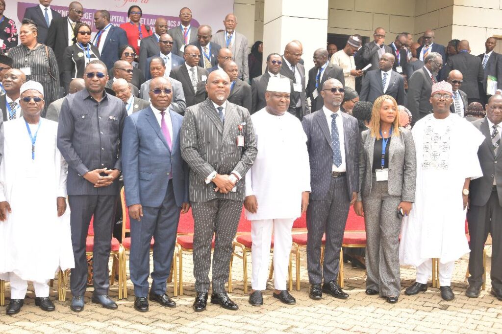 Caption: From left, Chairman Board, Securities & Exchange Commission(SEC), Mairiga Aliyu Katuka, Chairman Economic & Financial Crimes Commission (EFCC), Ola Olukoyede; Representative of the Chief Justice of Nigeria, Justice Stephen Jonah; Representative of the Vice President, Dr. Tope Fasua, Chairman, Senate Committee on Capital Market, Senator Osita Izunaso; Director-General of the Securities & Exchange Commission (SEC), Dr Emomotimi Agama, Executive commissioner Legal and Enforcement SEC, Frana Chukwuogor; and Deputy Chairman, House of Representatives Committee on Capital Market, Hon. Muktar Usman Zakaria, during a two-Day Knowledge sharing Workshop on Capital Market Law, Ethics and Judicial interpretation for Judges, held at National Judicial Institute in Abuja Monday.