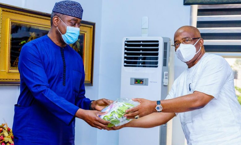 Caption: L – R shows Otunba Abimbola Ogunbanjo, President, National Council, Nigerian Stock Exchange (NSE), presenting a gift to His Excellency, Senator Hope Uzodinma, Governor of Imo State, during a courtesy visit to the Imo State Government House on Tuesday, 29 September 2020.