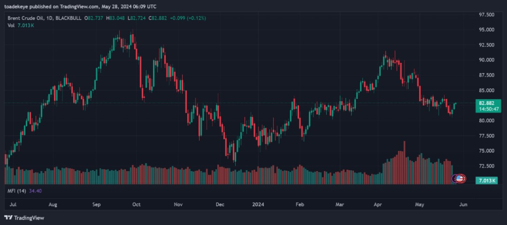 Oil prices increased by more than 1% in quiet trading due to public holidays in Britain and the United States. This followed a pessimistic week marked by concerns about U.S. interest rates amidst persistent inflation. The Brent crude July contract settled 1.2% higher closing at $83.12 a barrel while the more active August contract surged by $1.04 to close at $82.88.