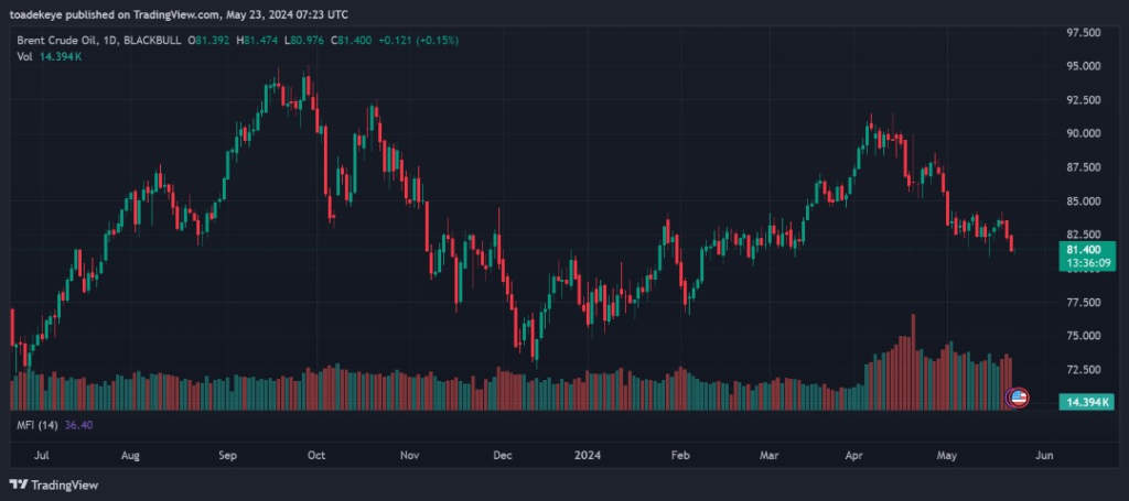 Oil prices dropped over 1% on Wednesday, marking a third consecutive day of decline, as Federal Reserve officials reignited concerns about oil demand by suggesting that interest rate cuts could be delayed due to ongoing inflationary pressures. The decline was supported by crude stocks increase of 1.8 million barrels during the week ended May 17. Brent crude futures was down by 1.18% closing at $81.90 a barrel while U.S. West Texas Intermediate crude (WTI) was also down by 1.39%,closing at $77.57