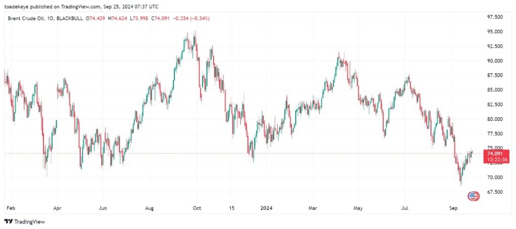 Oil prices increased about 2% to a three-week high on Tuesday due to China’s monetary stimulus(which typically boosts demand for oil) and worries that ongoing conflicts in the Middle East could disrupt oil supply(making demand greater than supply).Brent futures rose by 1.7% to settle at 75.17 per barrel, while U.S. West Texas Intermediate (WTI) crude also increased by 1.7% to settle at 71.56.