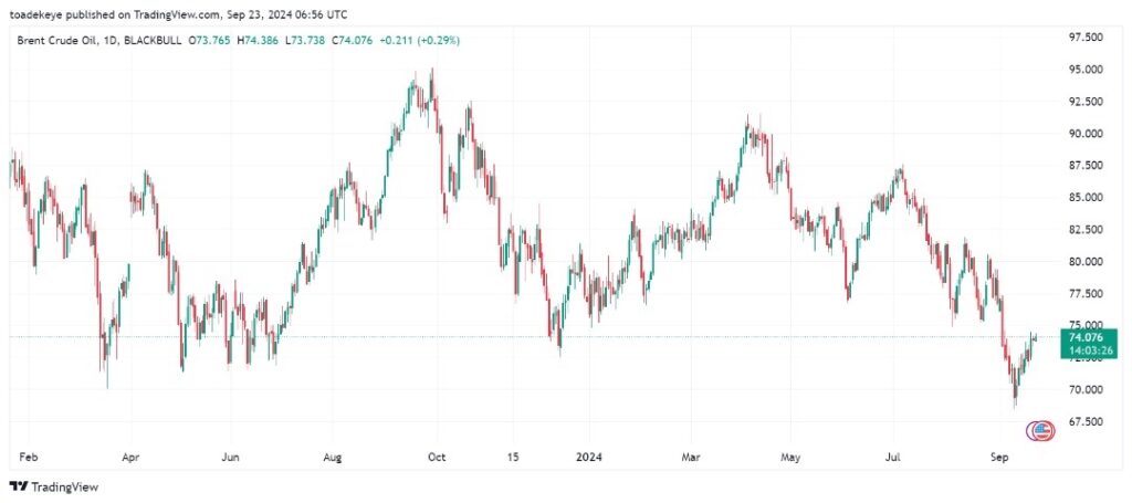 Oil prices ended lower on Friday but marked a second consecutive week of gains, bolstered by a U.S. interest rate cut and a decrease in U.S. supply. Brent futures settled at $74.49 a barrel, down 0.52%, while U.S. WTI crude futures closed at $71.92, down 0.4%. However, both benchmarks rose over 4% for the week. Typically, interest rate cuts lead to a weaker dollar, which can stimulate economic activity and increase energy demand.