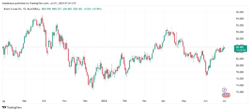 Oil prices dropped on Friday due to concerns over weak U.S. fuel demand and profit-taking at the end of the quarter, while May’s critical inflation data increased expectations that the Federal Reserve may initiate interest rate cuts this year. Brent crude futures for August settlement , which expired on Friday, was up by 2 cents to close at $86.41 a barrel. The more liquid September contract fell 0.3% to $85 a barrel. U.S. West Texas Intermediate (WTI) crude futures was down by 0.24%, to close at $81.54.For the week, Brent rose 0.02% while WTI futures posted a 0.2% loss. Both benchmarks gained around 6% for the month.