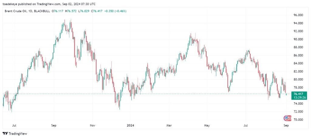Oil prices dropped approximately 2% on Tuesday due to concerns that slower economic growth in the U.S. and China might decrease energy demand. Brent futures fell by 2.3% to settle at $79.55 per barrel, while U.S. West Texas Intermediate (WTI) crude decreased by 2.4% to $75.53. However, indications suggest that the Federal Reserve is likely to adopt a dovish stance at its September policy meeting, which could potentially boost economic growth and increase oil demand.