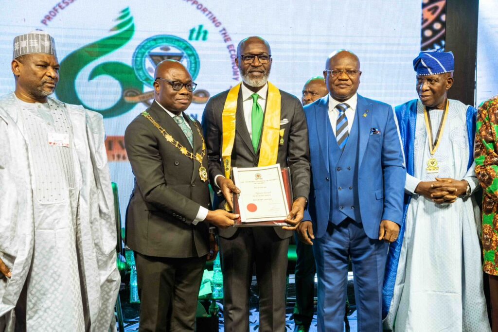 CAPTION: From left, Special Guest/Vice Chairman, Senate Committee on Diaspora and NGOs, Senator Anthony Siyako Yaro; Host and President, Chartered Institute of Bankers of Nigeria, Dr. Ken Opara; Managing Director/CEO, Access Bank PLC, Mr. Roosevelt Ogbonna; First Vice President of CIBN, Prof. Pius Olanrewaju and Past President, CIBN, Mr. Femi Ekundayo during the investiture of Ogbonna as a Fellow of CIBN at the Fellowship Investiture ceremony in Lagos…weekend.