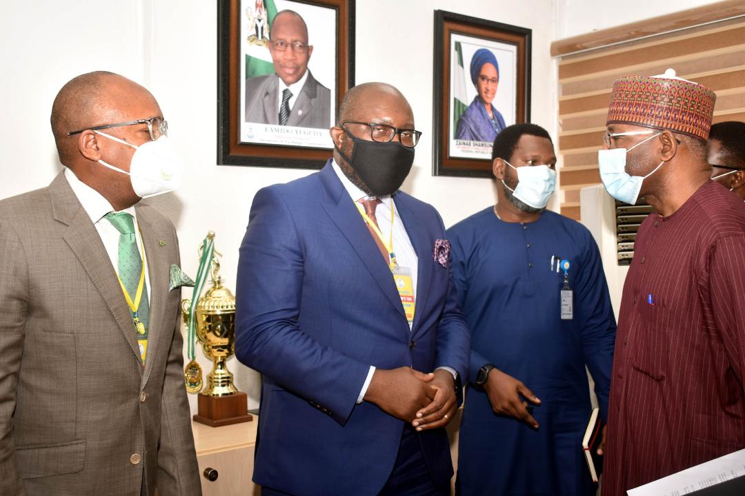 Caption: Managing Director Central Securities Clearing System Plc, Haruna Jalo-Waziri, on Wednesday led his management team to a meeting with executives of the Securities & Exchange Commission (SEC) in Abuja. Jalo-Waziri (left), in a chat with Director-General of the SEC, Lamido Yuguda. With them are the Divisional Head, Business Development of CSCS, Adeyinka Shonekan; and Executive Commissioner Operations, SEC, Dayo Obisan.