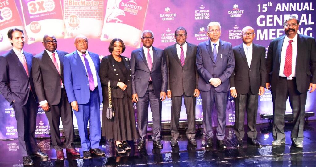 Caption: From left, Independent Non-Executive Director, Dangote Cement Plc, Alvaro Poncioni Merian; Independent Non-Executive Director, Dangote Cement Plc; Ernest Ebi; Independent Non-Executive Director, Dangote Cement Plc; Emmanuel Ikazoboh; Independent Non-Executive Director, Dangote Cement Plc; Dorothy Udeme Ufot; Chairman, Dangote Cement Plc, Aliko Dangote; Non-Executive Director, Dangote Cement Plc, Abdu Dantata; Group Managing Director, Dangote Cement Plc, Arvind Pathak; Non-Executive Director, Dangote Cement Plc, Olakunle Alake; and Non-Executive Director, Dangote Cement Plc, Devakumar Edwin, at the 15th Annual General Meeting (AGM) of Dangote Cement Plc, in Lagos on Tuesday, May 28, 2024.