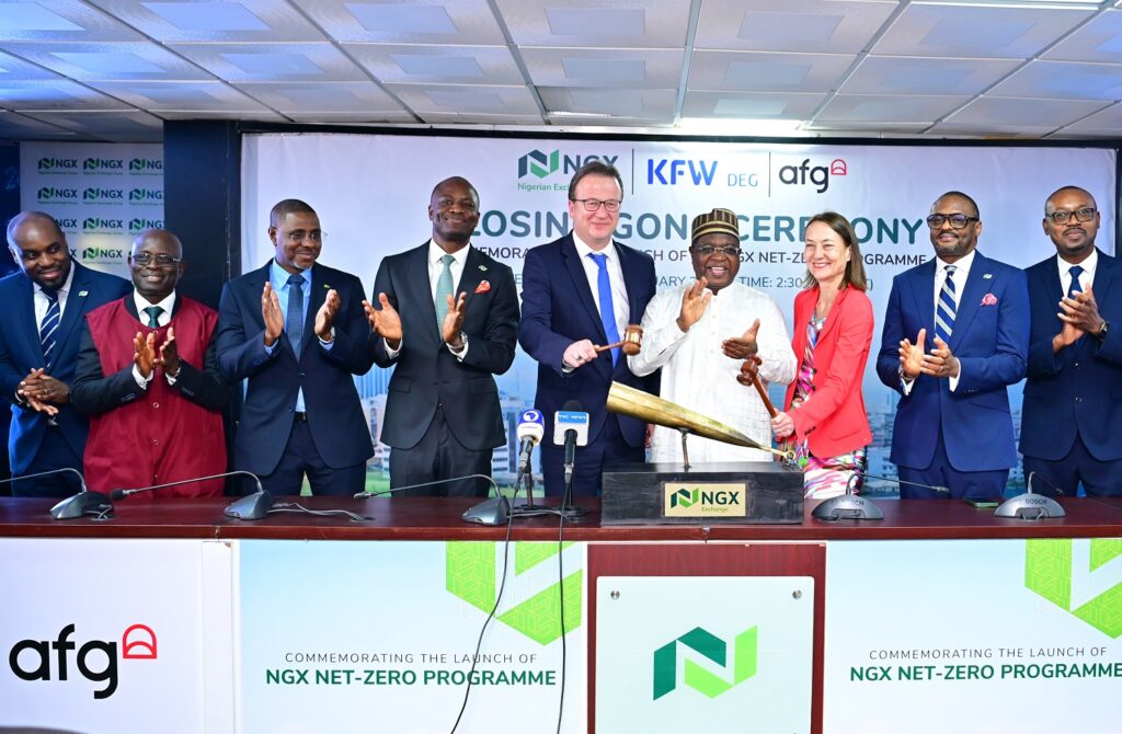 Caption: From left, Olufemi Shobanjo, Chief Executive Officer, NGX Regulation Limited (NGX RegCo); Seinde Adenagbe, Chairman, Association of Stockbroking Houses of Nigeria (ASHON) and Board Member, NGX Group; Shehu Yahaya, Chief Executive Officer, Central Securities Clearing System Plc (CSCS); Temi Popoola, Group Managing Director/CEO, Nigerian Exchange Group (NGX Group); Bernd Tilemann, Outgoing Country Director, Nigeria DEG (Deutsche Investitions- und Entwicklungsgesellschaft); Alhaji (Dr) Umaru Kwairanga, Chairman, NGX Group; Monika Beck, member, management board, DEG; Jude Chiemeka, CEO, Nigerian Exchange Limited (NGX) and Ikenna Mbakwe, incoming DEG Country Manager at the Closing Gong Ceremony at in Commemoration of the Launch of the NGX Net Zero in Lagos on Thursday.