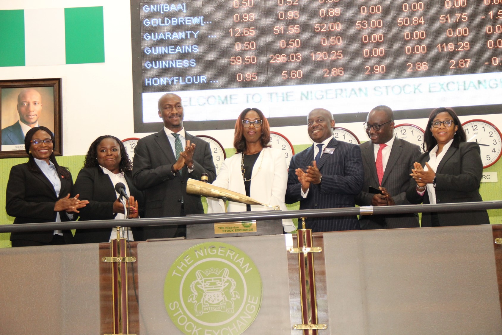 Caption: New chairman of Forte Plc, AbdulWasiu O. Sowami (third left), sounding the closing gong on Monday, July 1, 2019 when the new board and management of the company visited the Nigerian Stock Exchange to introduce themselves to the capital market community. With him from left are: Moshood Olajide, Chief Financial Officer of the company (left); Olumide Adeosun, Chief Executive Officer (second left); Olumide Bolumole, Divisional Head, Listing Business of NSE (middle); Aniola Durosinmi-Etti (third right); and Olusola Adeeyo (second right), both Independent Non-Executive Director of the company; and Funso Akere, CEO, Stanbic IBTC Capital (right).