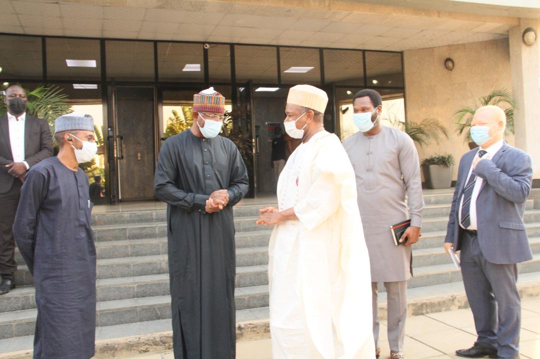 Caption: Director-General of the Securities and Exchange Commission (SEC), Lamido Yuguda (second left), welcoming Kebbi State Governor, Alh. Abubakar Atiku Bagudu (middle), to the commission’s Abuja headquarters for a meeting with the management on Thursday, January 14, 2021. With them are SEC Executive Commissioners: Ibrahim Boyi, Corporate Services (left); Dayo Obisan, Operations (second right); and Reginald Karawusa, Legal and Enforcement (right).