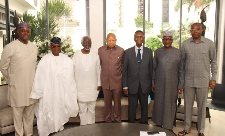Caption: From left, past Presidents, National Council of The Nigerian Stock Exchange (NSE), Otunba Abimbola Ogunbanjo (now Chairman, Board of Directors, Nigerian Exchange Group Plc); Oba Otudeko (chairman, Honeywell Group; Frank Aig-Imoukhuede, Former Federal Director of Culture; Pascal Dozie; Goodie Ibru; Alhaji Aliko Dangote (President, Dangote Group); and Aigboje Aig-Imoukhuede, also a past President of the NSE and Chairman, Coronation Capital, during a condolence visit to Aig-Imoukhuede, to commiserate with his family on the death of his mother, Mrs. Emily Aig-Imoukhuede.