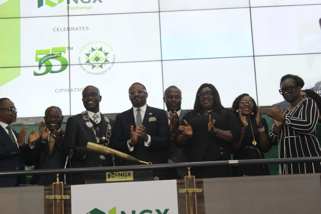 Caption: From left, Kennedy Dike, MCIPM – Conference Planning Committee Chairman; Mike Itegboje; Olusegun Mojeed, President & Chairman of Governing Council of CIPM; Jude Chiemeka, Executive Director Capital Markets, NGX; Henry Unuakpor, MCIPM, Vice President; Ms. Oluwatoyin Naiwo, FCIPM, Registrar/Chief Executive; Mrs. Adeola Adepegba, Elected Council Member and Ugochi Obi, Head, X-Academy, NGX during a Physical Closing Gong Ceremony in commemoration of the 55th Anniversary Celebration of the Chartered Institute of Personnel Management of Nigeria (CIPM) at the Exchange today 12 October 2023 in Lagos.