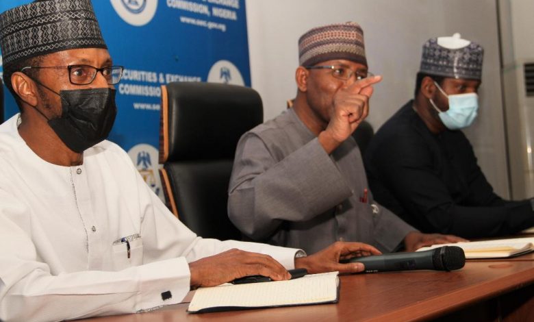 Caption: Director-General of the Securities & Exchange Commission (SEC), Lamido Yuguda (middle), making a point during a meeting between the management and staff of the commission in Abuja at the weekend. He is flanked by the Executive Commissioner, Corporate Services, Ibrahim Boyi (left), and his colleague in charge of Operations, Dayo Obisan.
