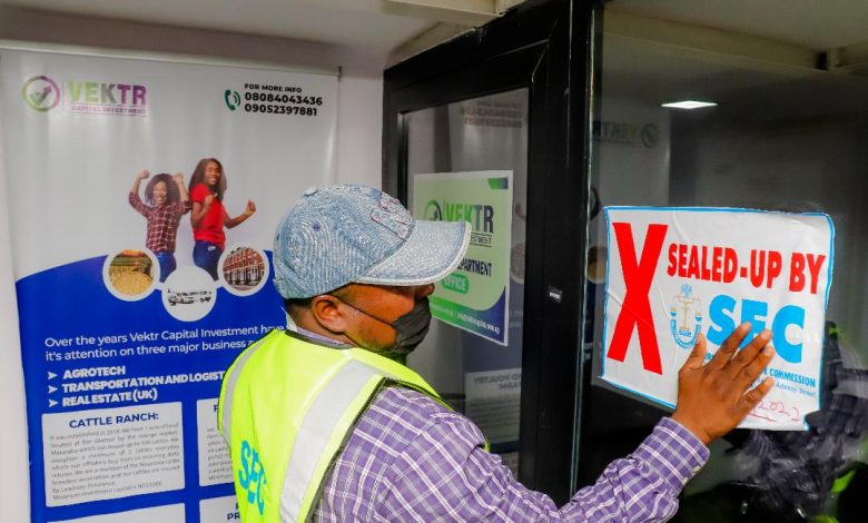 Caption: Officials of the Securities and Exchange Commission (SEC) during an enforcement exercise to the office of Vektr Capital investment, Onikan, Lagos, for alleged Illegal investment Activities. Other firms that were sealed by the commission for unlicensed and alleged illegal Investment Activities are: Oxford International Group, Farmforte Agro Allied Solutions Limited and Agro partnerships.