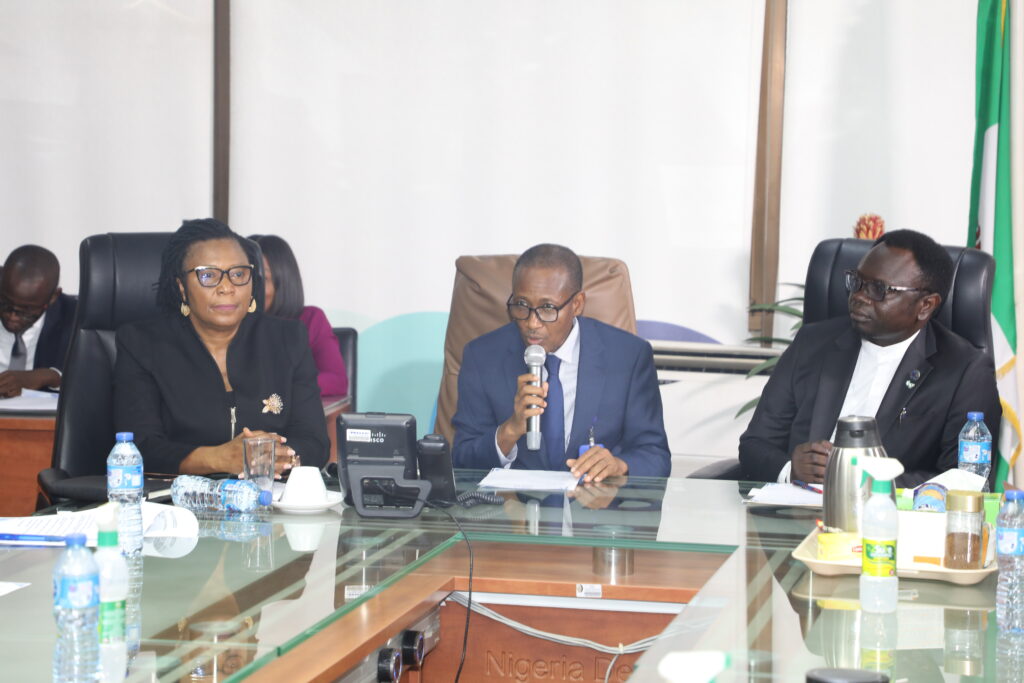 Caption: Executive Director (Operations) at the Nigeria Deposit Insurance Corporation (NDIC), Mustapha. M. Ibrahim (Middle), making his welcome remarks to the Minister of State for Youth Development, Ayodele Olawande (left) while Executive Director (Corporate Services), Mrs. Emily Osuji, looks on during the Minister’s courtesy call on Management of NDIC Corporation in Abuja.