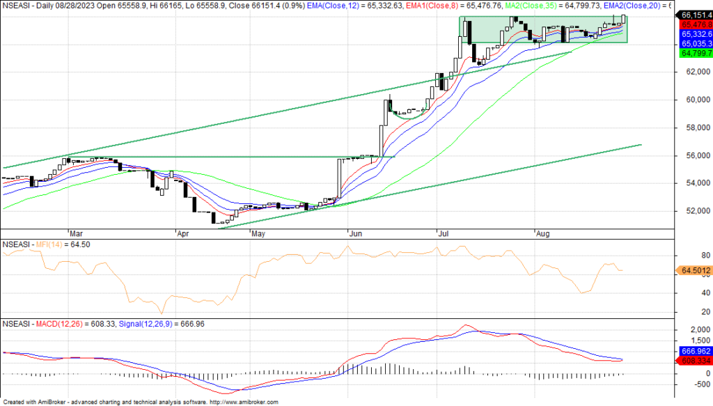 The NGX index’s action is currently trading above the 66,000 basis points, ‘T line’ and 50-day moving average, attracting bargain hunters to position in fundamentally sound medium and low cap stocks amidst digesting of scorecards of many companies and prevailing macroeconomic factors including exchange rates, yield in money market and Q2 GDP. It is therefore time to use technical tools, if you have been ignoring charts and fighting the trends, it is your chance to step up your game. It is pertinent to stress the fact that profit taking is part of market dynamics, which can occur at any time, as we look forward to a mixed outing and intermittent profit taking, since policy factors that pushed the market up are shaking, as market wait for favorable news and statements from the minsters.