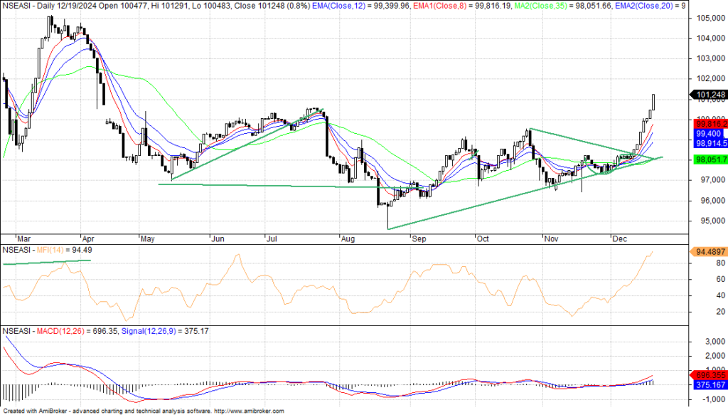 The uptrend on the NGX continued for the eighth consecutive session on a low traded volume and positive market internals, with money flow supporting the ongoing Santa Claus rally that is associated with year-end seasonality and sentiment. The index’s action broke out the 101,000 basis points psychological line in the midst of buying sentiment and markup phase to reflect funds entering the equity space, even as sector rotation and portfolio rebalancing continued ahead of 2025. Despite the relatively low transactions volume, smart money is already in the market and some stocks. This created buying opportunities for discerning players ahead of the usual January effects that had turned a positive pattern and trends on the NGX in recent years to guide positioning in the right stocks at the right prices.