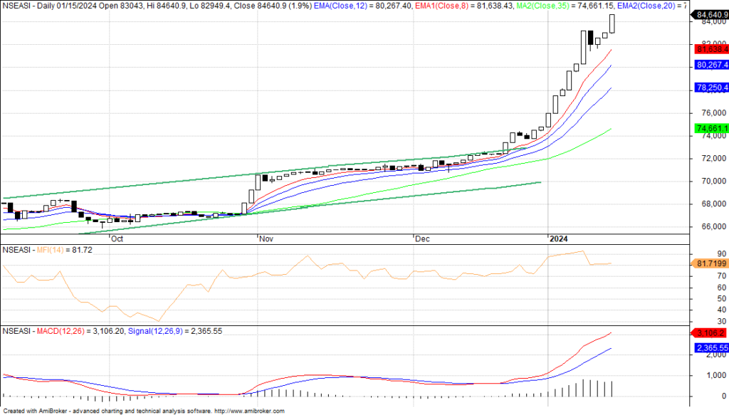 The NGX index’s action remains above the T-line, as it makes another new historic milestone of breaking out strong resistance level of 83,240.25 point to cross the 84,000 psychological line in the midst of high volatility and positive momentum to trade above the short and long term Moving Averages on the daily, weekly and monthly time frame. Portfolio rebalancing on the exchange continued as earnings and the dividend season draws closer with unaudited Q4 results hitting the market any moment from now, just as more companies like PZ, Transcorp, Transcorp Hotel, GSK and others notified the NGX and investors of their board meetings and closed period for the 2023 full-year financials. There is also the January effects and other factors associated with the increasing economic headwinds