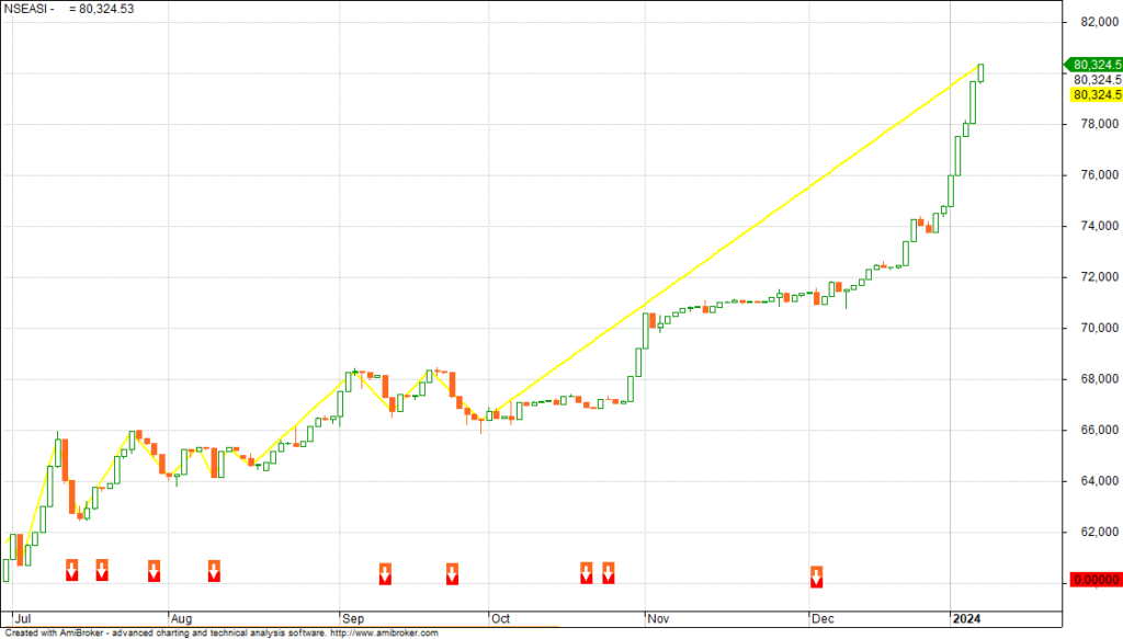 We expect positive sentiment and profit taking to continue, as NGX crosses 80,000 psychological line on positioning by bargain hunters ahead of unaudited Q4 2023 numbers and volatility in the face of expected December CPI and coming MPC meeting, as pullback at this point will add more strength to upside potential. As such, investors should take advantage of price correction. Also looking at the trends and events across the globe and domestically.