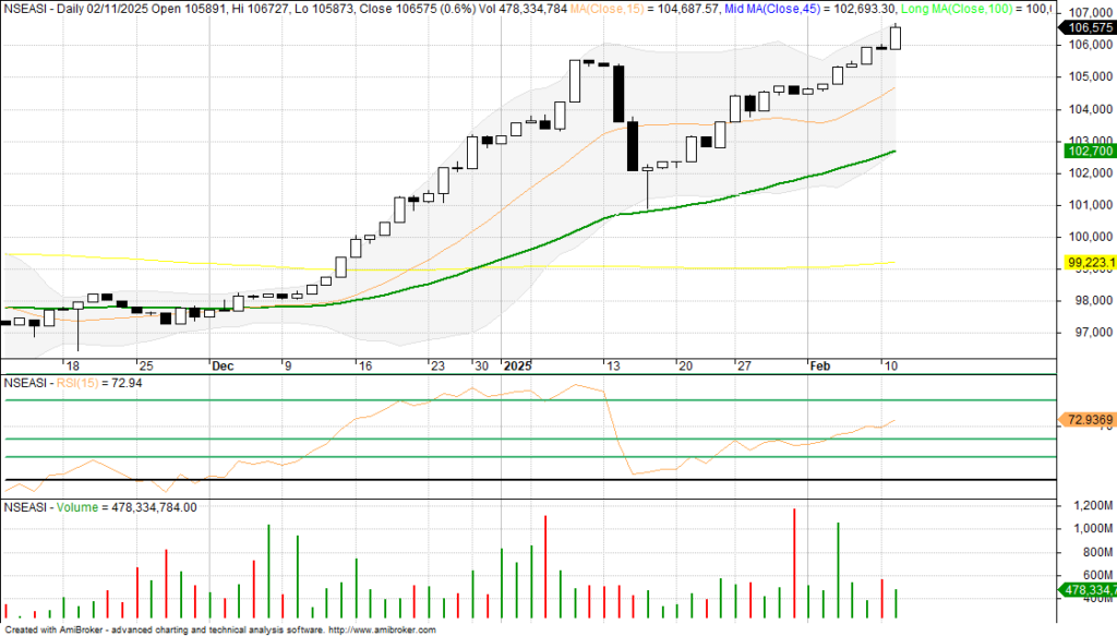 Trading on the Nigerian Exchange on Tuesday wiped out previous session’s marginal loss, as the key performance NGX All-Share Index rebounded, breaking out the strong resistance level of 106,087.80 basis points to a new all-time high of 106,575.00bps after touching 106,726.60bps. The strong buying interests across some mid to high cap stocks weighed on the index positively as it closed higher on a low traded volume and positive market breadth, reflecting accumulation in some stocks and sectors.