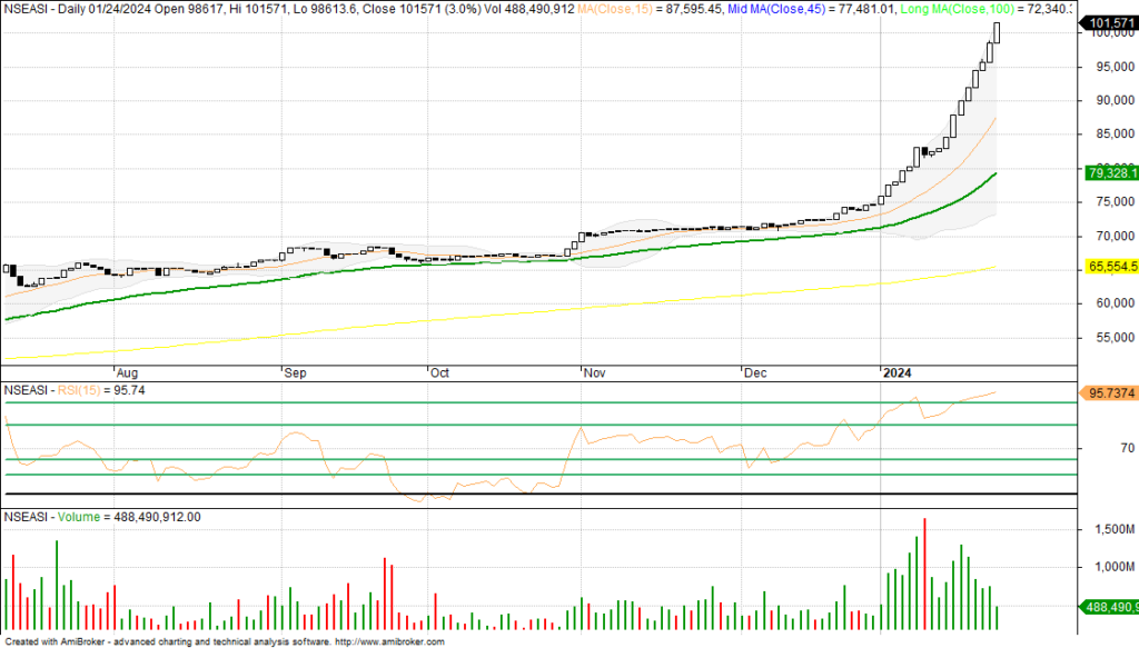 The strength behind the trend or the session remained strong as revealed by momentum indicators, despite the overbought state of the market, as the ADX read 80.19, while RSI and Money Flow Index are looking flat to 95.74 and 88.68 points against the previous session 95.04 and 88.93 points respectively. This should be a concern for investors and smart traders as they trade with caution. The trading volume pattern suggests hold and watch disposition of market players, as profit taking continue while investors accumulate more positions in some stocks as others investment windows returns remain below inflation and negative. Also, the anticipated financial market and economic reset in 2024, comes with huge opportunities to create wealth for smart investors and traders.