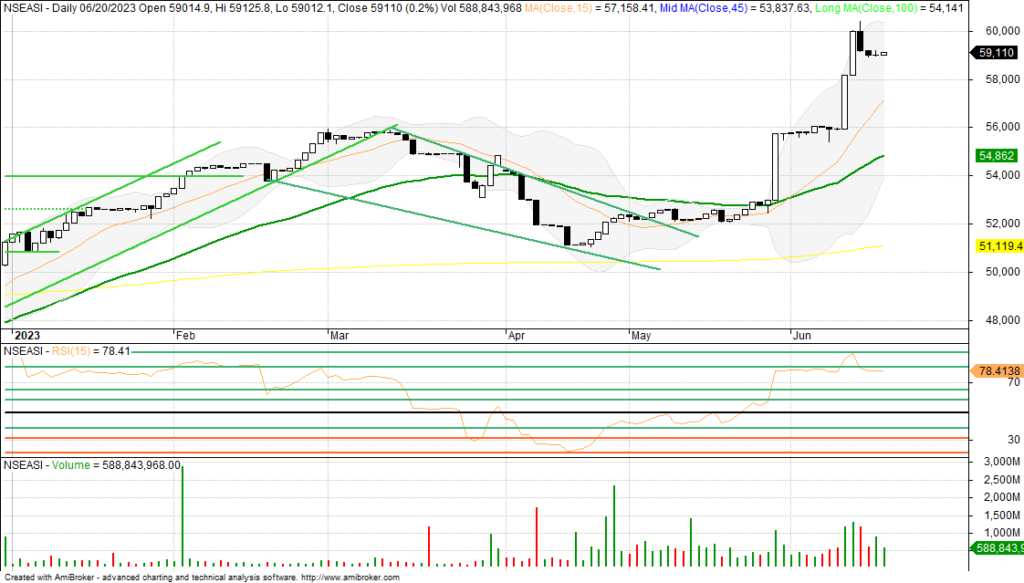 The NGX remains above the 59,000 mark, positive sentiment and buying interests during the session, with the index still at its 16-year market high on above average traded volume. In the process, many stocks are hitting new 52-week highs on strong buying sentiments and expected fall in interest rates as the government looks to reform monetary policy after the recent unification the foreign exchange rates.