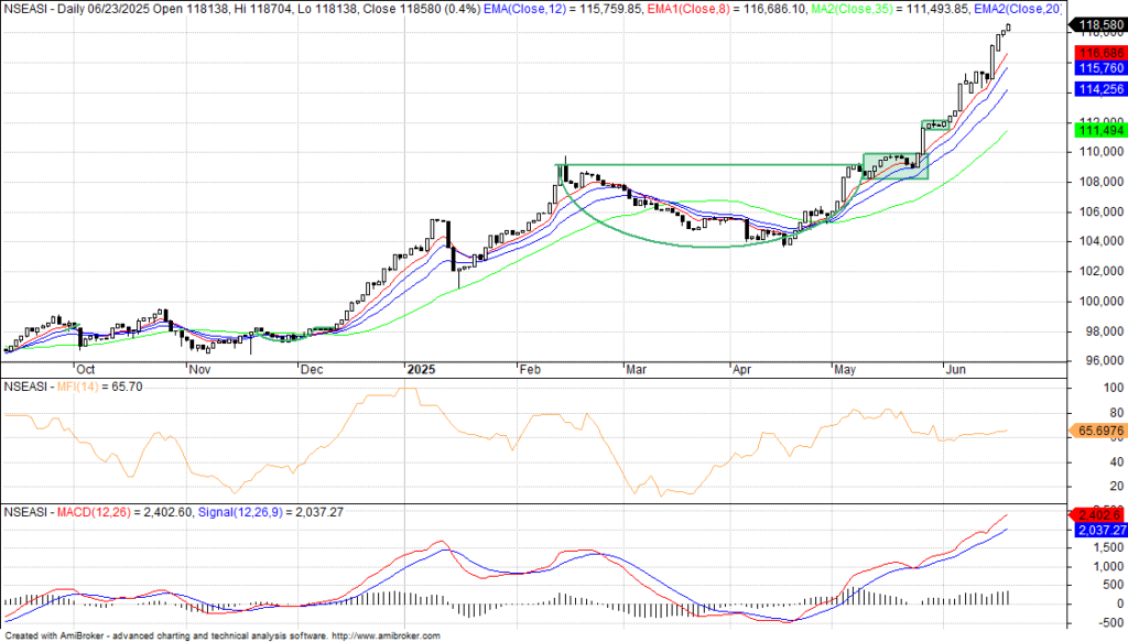 The relatively high traded volume since late April signals investor confidence around government’s economic reforms and foreign investors participation in the market which had supported money flow into the market, although it is relatively low, compared to the inflows seen in the month of May 2025. The market in recent time, have continued to make a new all-time high, hitting 118,579.90 basis points, as more stocks are also attain their new 52-week high, just as sectors witness breakouts, following which the index action is heading towards the 120,000 points mark as the earnings season draw nearer by the day.