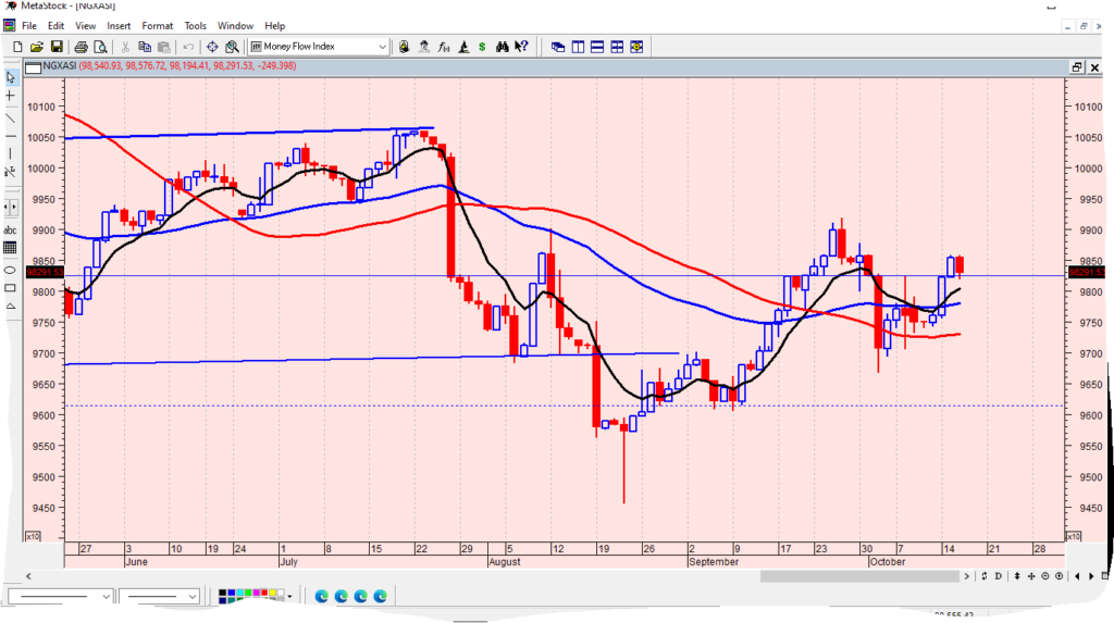 As mentioned in our previous update, market players should watch out midweek trading to confirm the NGX index action breakout of 98,223.04 basis points Tuesday, after forming a triple top chart pattern on a low traded volume in the face contracting breadth, buying sentiments and funds leaving the market as indicated by money flow index. The pullback confirmed a fail breakout that halted three consecutive sessions of bull transition in the midst of impressive Q3 numbers from Champion Breweries and United Capital.