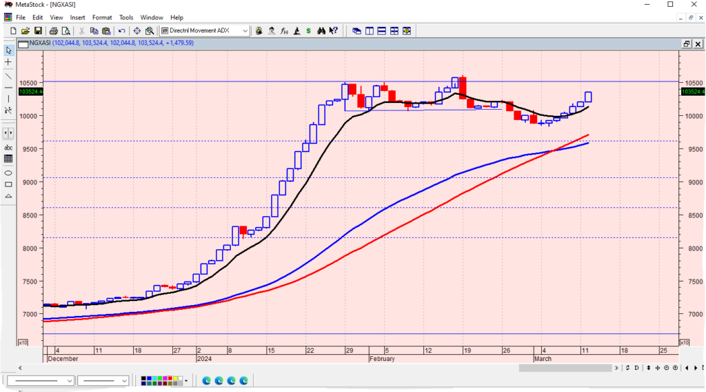 The bull run continued on the Nigerian Exchange on Tuesday, with the composite NGX All-Share index closing higher on increased buying interest in banking stocks, pushing the index’s action to breakout another psychological line of 103,000 on a high traded volume and positive market breadth. There were position taking across major sectors of the market in expectation of more corporate earnings and actions ahead of midweek’s Central Bank of Nigeria Treasury Bill primary market auction and February inflation report from the NBS on Friday.