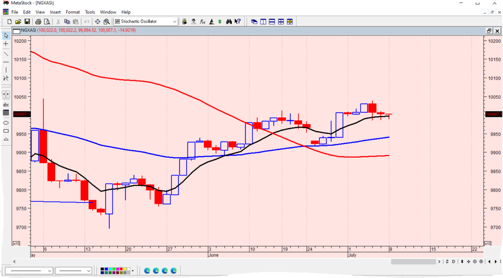 At the same time, the market is forming a triple bottom pattern that also supports reversal of trend, as revealed by the candlestick at the end on Monday trading. Weakness after strength in price action shows a strong support level 99,800 even as resisting it may signal another demand zone ahead of companies and economic numbers that will confirm a new uptrend depending on of the state of corporate earnings and macroeconomic indices as all eyes are on these numbers to drive flow of funds in the financial market. As more corporate disclosure regarding banks recapitalisation continued with GTCO announcing plans to launch public offer of 9 billion ordinary shares at N44.50.
