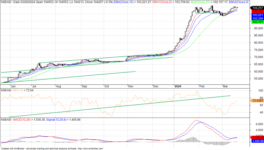Midweek’s trading started in the red and oscillated for the rest of the session, on profit taking hitting some stocks, while buying interest continue in some stocks. This situation pushed the NGX’s index to an intraday low of 104,212.90bps from its highs of 104,553.30bps, before closing below its opening figure at 104,256.8bps.
