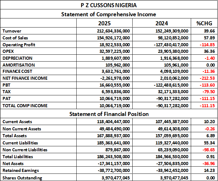Comparing the financials released by the company’s management for the year ended 31st May, 2025 with that of 2024, we observed a 39.66% growth in turnover figure from N152.249 billion to N212.63 billion. Direct Cost of Sales was estimated at NN154.926 billion, same as 57.89% above the N98.120 billion reported in the corresponding period. Operating Profit for the period stood at N18.922 billion compared with an Operating Loss of N127.430 billion in the corresponding period of last year. Operating Cost grew to N32.597 billion, as against N23.905 billion in the comparable year. Profit before Tax is valued at N16.660 billion, while the Total Profit for the year is N10.066 billion, this is a major recovery from the Loss Position of posted last year. See the below table for details:
