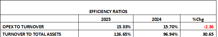 Operating Expenses remained well-controlled, with Operating Expenses to Turnover Ratio slightly improving to 15.33% from 15.70%, indicating better cost discipline and improved expense management relative to revenue. In addition, Turnover to Total Assets increased markedly from 96.94% to 126.65%, showing enhanced assets utilization and stronger revenue generation from existing resources.