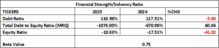 The Company’s financial position remains fragile, reflecting its persistent over-leverage and negative shareholders’ equity. Although the Debt Ratio improved marginally from 117.51% to 110.93%, it still shows that Total Liabilities exceed Total Assets, underscoring the high reliance on debt financing.