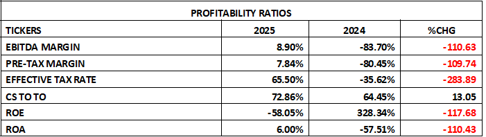 The company’s profitability shows a significant improvement, though recovery remains incomplete. EBITDA margin rose sharply to 8.90% from a loss of -83.70%, indicating a strong turnaround in core operations and better cost control. However, Cost of Sales to turnover increased to 72.86% from 64.45%, suggesting that production or impute costs are still pressuring gross margins.
