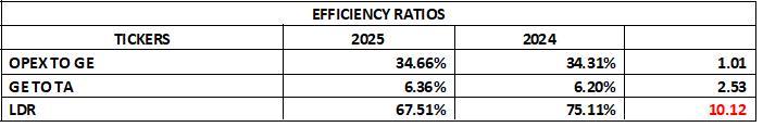 Gross Earnings to Total Assets ratio inched from 6.20% to 6.36% indicating more efficient deployment of assets, better interest earning portfolio, stronger loan book performance, and effective asset mix management. Loan to Deposit Ratio equally moved from 75.11% to 67.51%, ab indication of how much of customers’ deposit are converted into loans and advances. The decline means the bank is lending out a smaller portion of its deposits. In our opinion possible reasons are: a cautious lending stance amid economic uncertainties, and diversification into low-risk or non-loan income source.