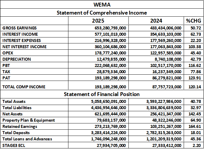 Going by the unaudited numbers released recently, representing the full year 2025 business session, the management of Wema Bank achieved Gross Earnings of N653.280 billion, compared to N433.434 billion in the corresponding period of 2024. Interest Income stood at N577.101 billion, versus N354.633 billion, while Interest Expenses stood at N216.996 billion against the previous N177.569 billion. Operating Expenses through the 12 months stood at N178.777 billion, compared to N122.957 billion in the preceding year. Profit before Tax estimate stood at N222.068 billion versus N102.517 billion in the prior year. Total Tax Expense reported for the year is 28.879 billion against N16.237 billion.