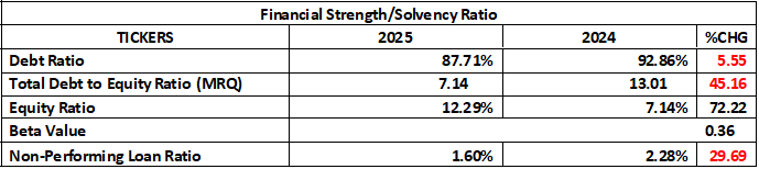 - Debt Ratio: (87.71% Vs 92.86%): The decline from 92.86% to 87.71% is a significant improvement, meaning the bank is now less leveraged and less dependent on borrowed funds. Nevertheless, it should be noted that, for banks, high leverage is normal, but a reduction of over 5% points indicates stronger balance sheet discipline and possibly improved capital retention.