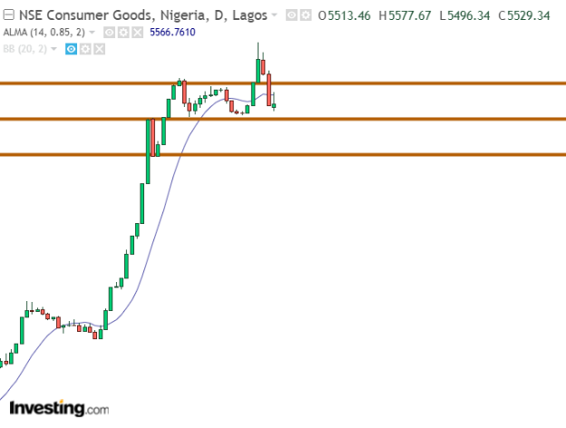 The consumer goods index traded below its moving average, indicating a strong bear sentiment. Despite this performance, the index closed bullish, which signals market recovery. Since the index hasn’t broken the distribution zone support level, it’s expected that the market will maintain its solid momentum.