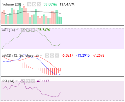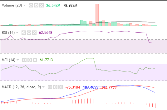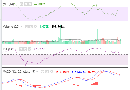 Volume is low for this index, while RSI and MFI depict sustained momentum in the market. The market closed partially indecisive as buyers and sellers struggled to dominate. Yet, volume remains bullish and at the same level as yesterday’s performance. This performance informs market analysts that buyers remain dominant, despite low volume.