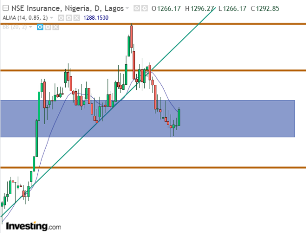 Volume validates the index’s Elloit wave formation by confirming the market’s bull sentiment. MACD remains bearish, indicating that investors have an opportunity to participate. Finally, MFI and RSI indicate steady liquidity and momentum in the market. How’s insurance leading the NSEASI?