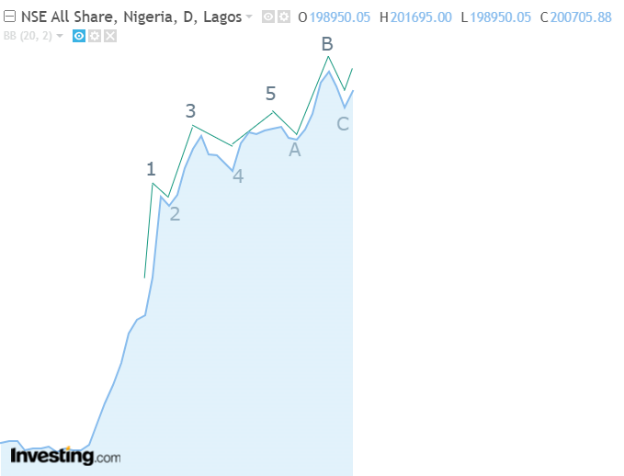 Market analysts use the Elliot wave to understand the psychology of traders and investors. They also use it to predict a market outlook. In NGXASI’s case, this wave signals a potential bull surge that could break its all-time high (204928.11 bps)