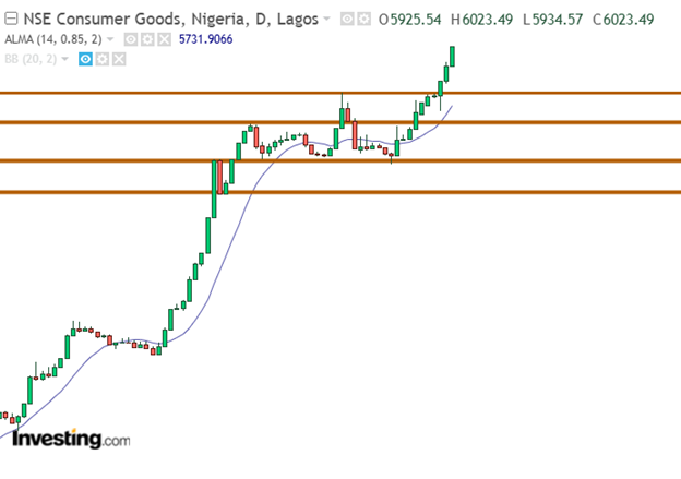 The consumer goods index gained a basis point of 1.65% with a 100% buy sentiment. The index continued to scale upward and create a new all–time high. In Thursday’s performance, the index advanced from 5925.54 bps to 6023.49 bps without resistance. This action reflected an increased investor interest in the index.
