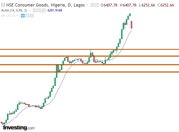 The NGXCSMG declined by 4.36%, following a strong markup phase. The index closed at 6,284.87 above its moving average. This performance officially commences the distribution phase for the consumer goods index. The companies that influenced this sentiment include the top losing blue-chip banking companies. This massive loss also included companies such as GUINNESS (-10%) and REDSTAR (-9.95%)