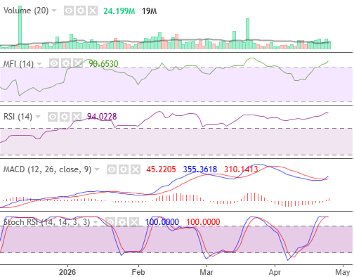 The NGXCSMG remained strong amid profit-taking. MFI remained above its 50-point benchmark at 84.19. RSI declined into its neutral zone, indicating a moderate bullish sentiment. Stochastic signaled profit-taking, while MACD remained bullish with a declining momentum.